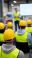• Industrial workers wearing yellow safety helmets and reflective vests attending a workplace safety training session in a factory.