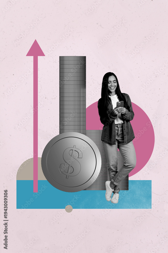 • Pop poster collage of person use device stand near stock coins arrow up on pink background