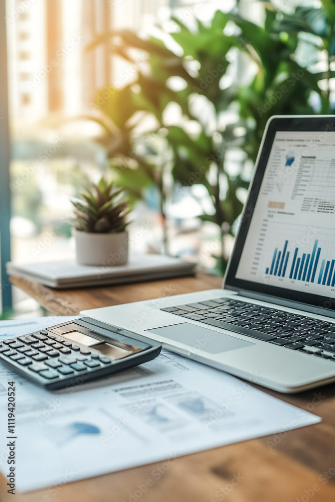 • Modern Workspace with Financial Analysis on Laptop and Calculator on Desk