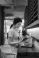 • Woman working on laptop and using calculator at cafe counter during casual financial planning session