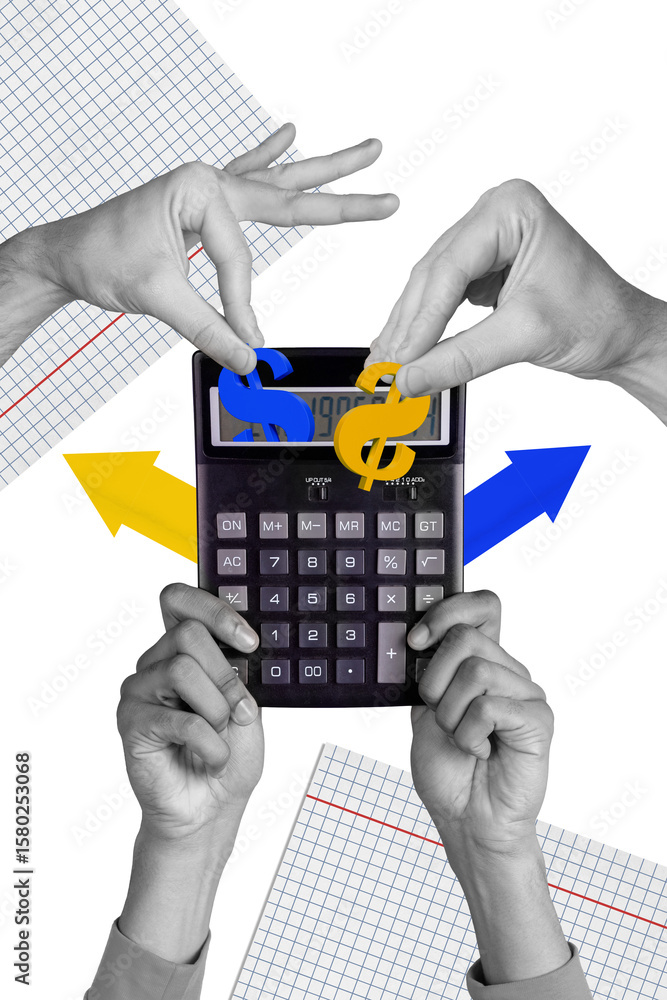 • 3d retro abstract creative artwork template collage of arms counting money calculator isolated painting background