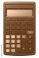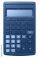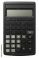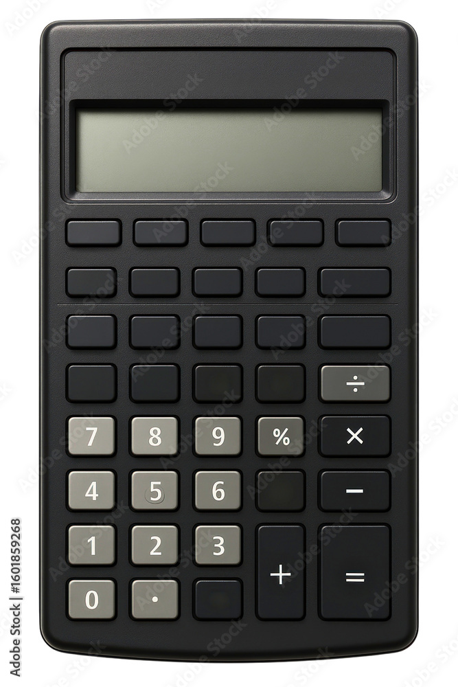 • Black electronic desktop calculator with a large digital display on a transparent background