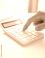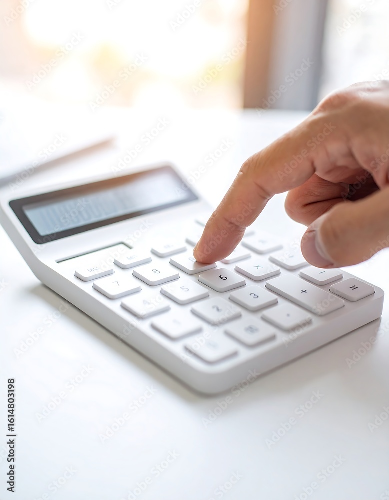 • Close-up of a hand using a calculator on a white surface