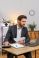 • Middle-aged businessman at home office enters numbers on laptop checks amounts with calculator and receipts. Freelancer guy at table reviews bills and signs documents with calm focus and steady hand.