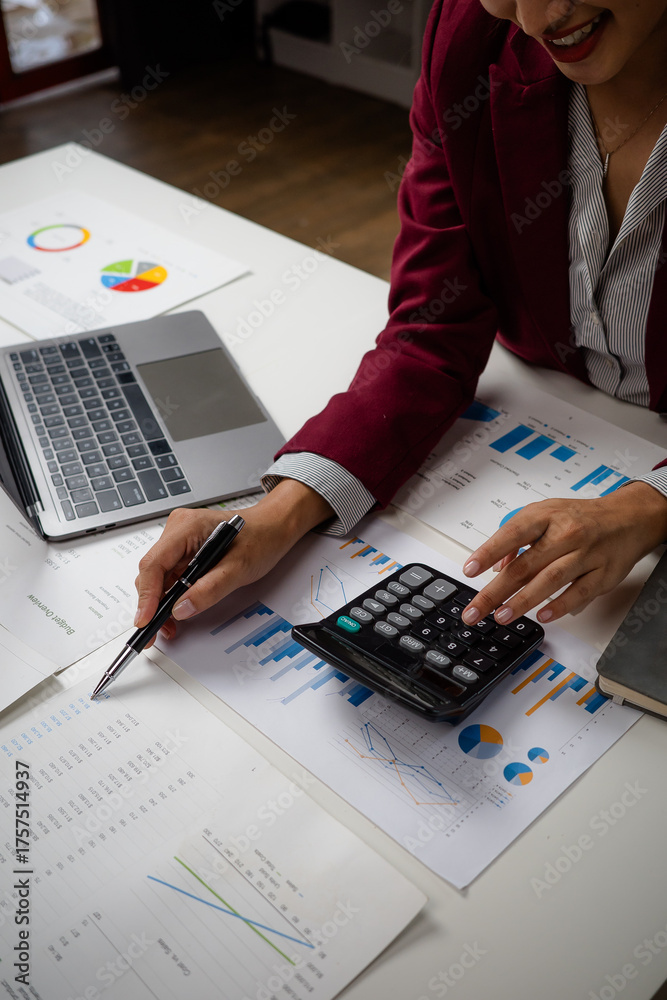 Do Biura Rachunkowego - Businesswoman analyzing financial data using calculator and budget charts #1757514937