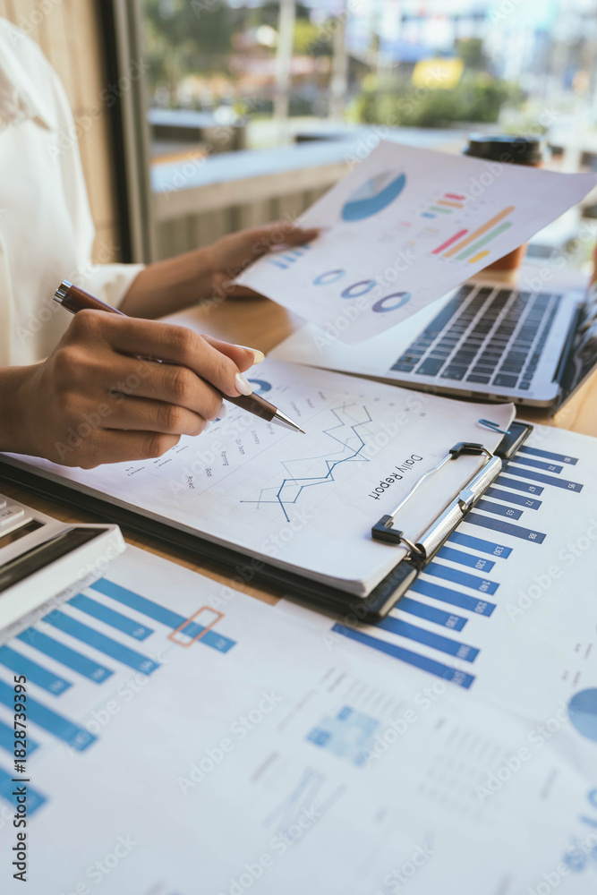 Do Biura Rachunkowego - A person reviews financial charts while using a calculator and laptop on a desk, focusing on data... #1828739395