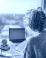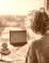 • A woman sitting at a desk by a window, working on a laptop surrounded by papers and a calculator, the concept of remote work and financial planning.