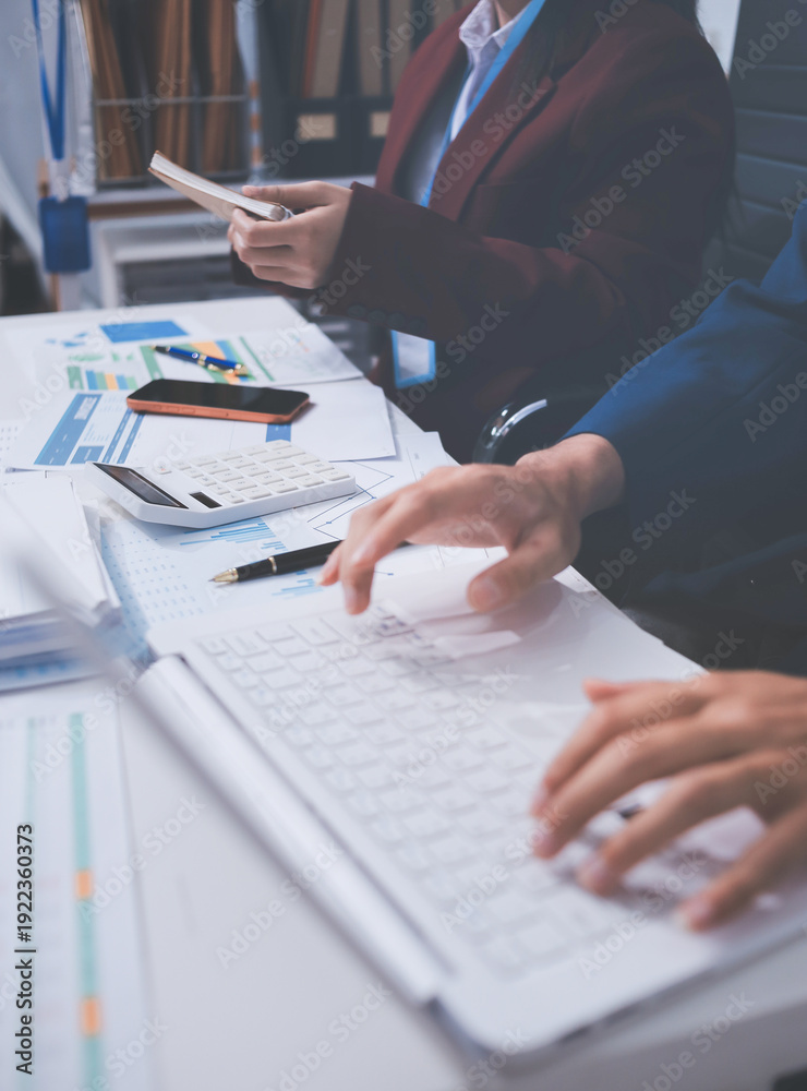 • Accounting company provide finance and taxation planning for profitable cash flow, Auditor and accountant team working in office, analyze financial data and accounting record with calculator