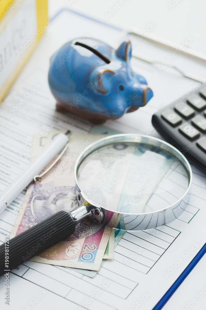 Do Biura Rachunkowego - Clean insurance blank, Polish zloty, magnifying glass, calculator and piggy bank #198981722