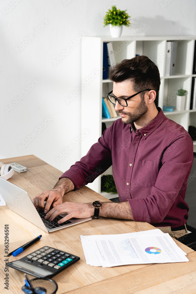 Do Biura Rachunkowego - concentrated businessman typing on laptop near documents and calculator #363296501