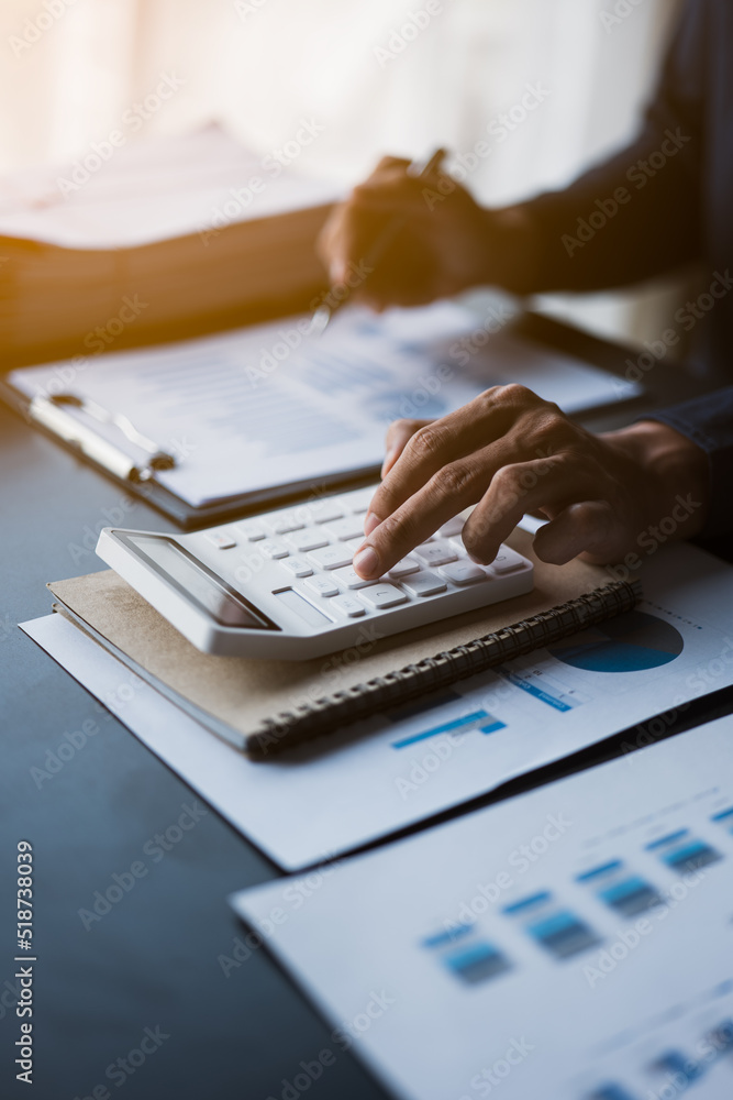 Do Biura Rachunkowego - Close up of hands working and calculating on financial and accounting graft and chart in office... #518738039