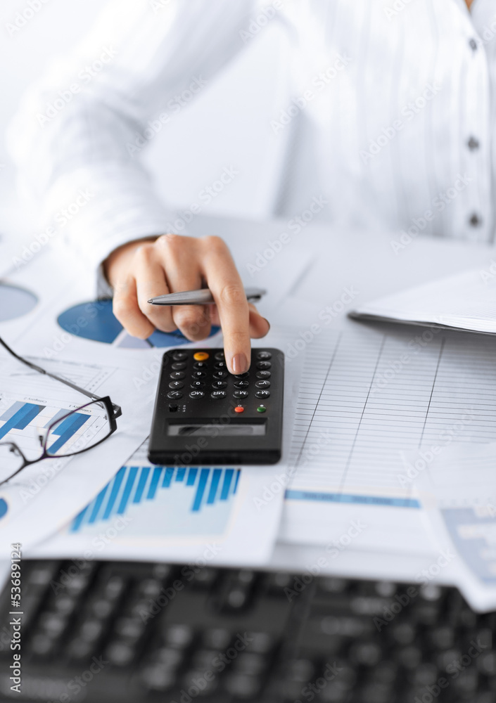 Do Biura Rachunkowego - woman hand with calculator and papers #53689124