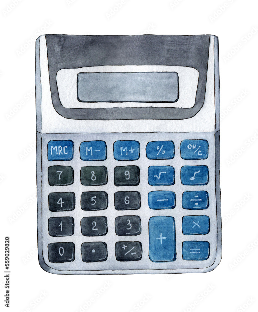 • Watercolor gray calculator for calculating numbers, mathematics, algebra. "Back to school" Student supplies for posters, posters, postcards, holiday decor. Isolated on white background. Drawn by hand.