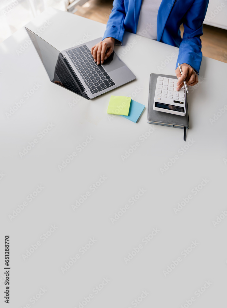 • Portrait of woman working in finance using tablet computer and calculator in modern office Prepare account analysis reports Real estate investment information Financial and tax system concepts