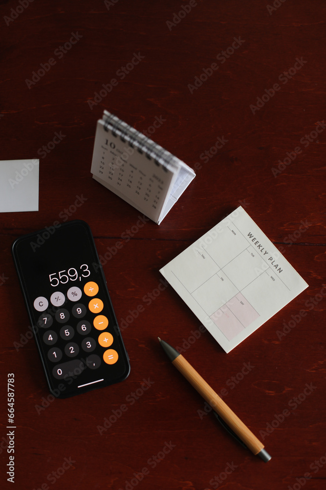 • Flatlay of calculator on mobile phone, pen, calendar, planner, notepad on table background. Aesthetic home office desk workspace. business, work, blog template with mockup space. Flat lay, top view