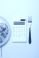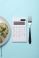 Do Biura Rachunkowego - Plate with calculator, measure tape and fork on blue background. Reset evening, count calories #753218790