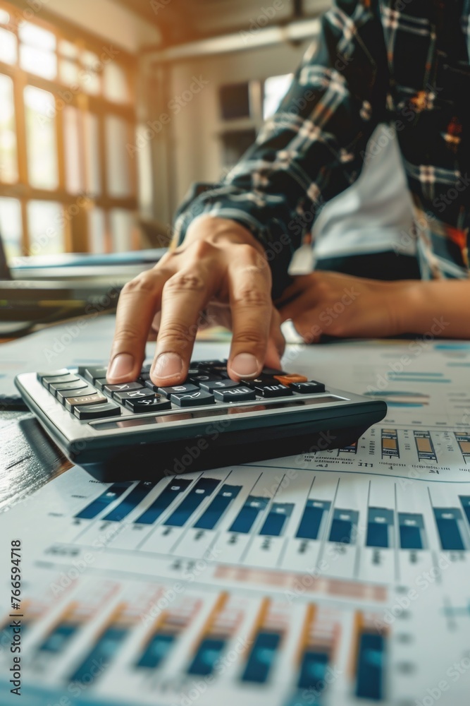 • A person using a calculator on a desk. Suitable for business and finance concepts