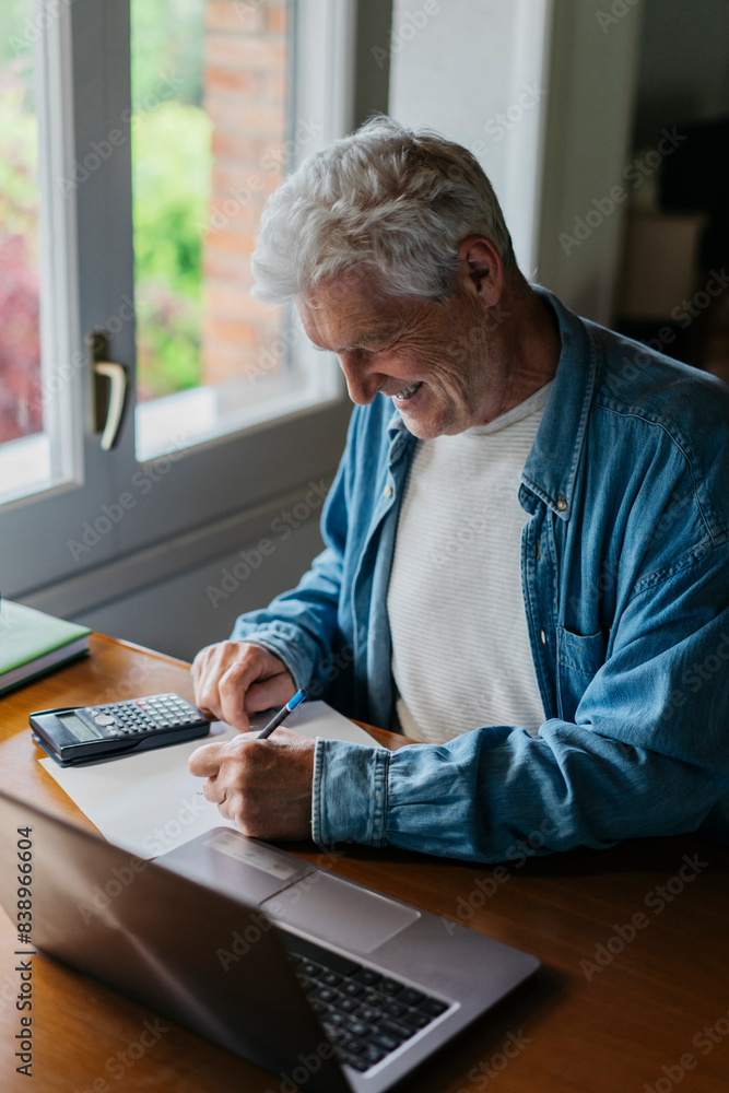 Do Biura Rachunkowego - Happy senior man writing on paper while using calculator and laptop at home #838966604