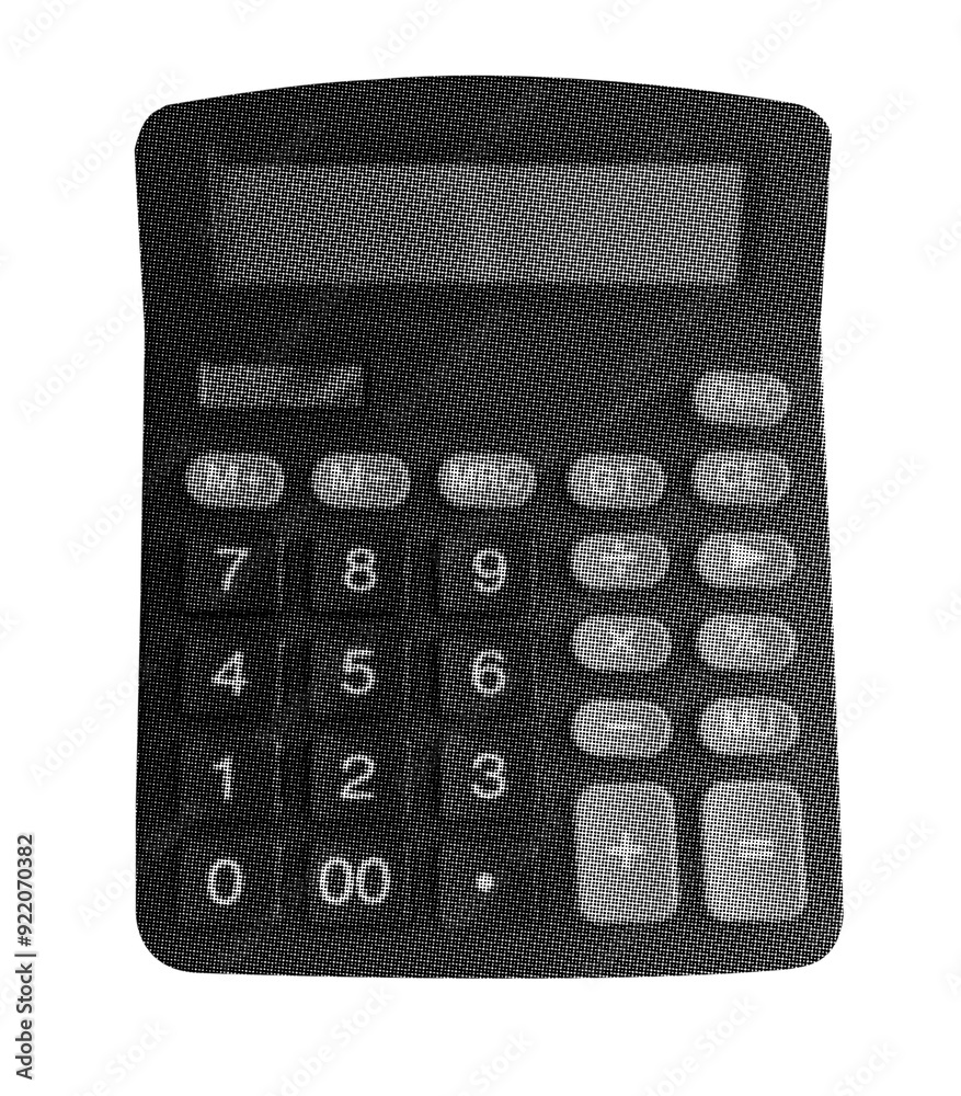 • Dark electronic halftone calculator in trendy vintage style. Digital keypad math device on isolated background
