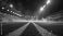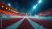 • Empty stadium track at night. White lines mark lanes on ground. Stands are visible in distance. Floodlights illuminate venue. Competition or training setting at sports arena with fog.
