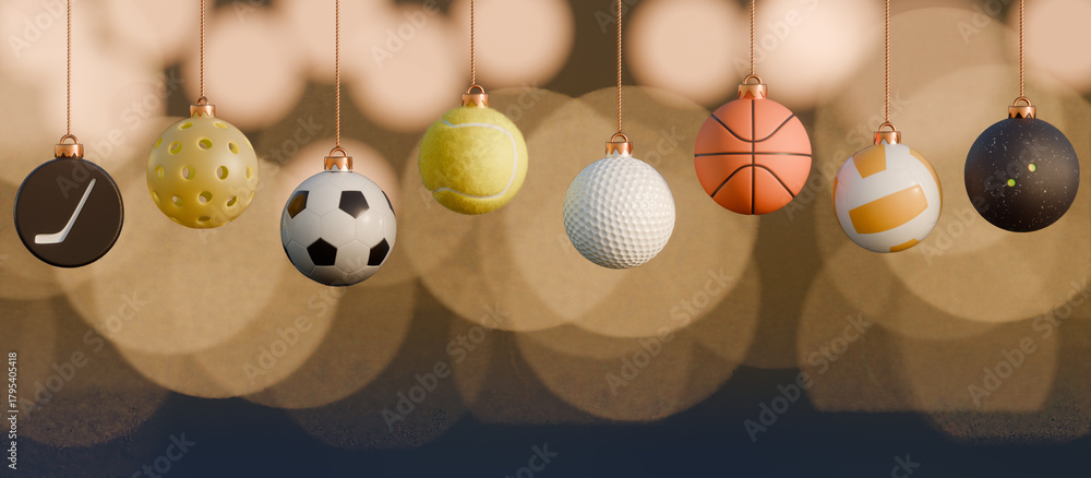 • Sports theme christmas ornaments featuring various sports balls hanging as holiday decorations. 3d rendering