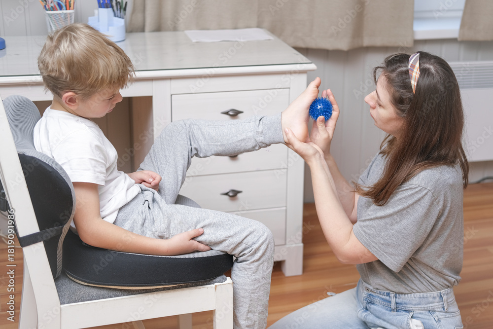 • Mother using a spiky massage ball for son to relieve muscle tension, aid recovery after training. Mom massaging child boy with tactile knobby ball. Kid rolling sensory ball. Therapy muscles treatment