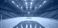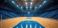 • Empty indoor basketball court with polished wooden floor, blue seats for spectators. Professional sport arena with hoop under bright spotlights awaits competition. Large stadium gym ready for big
