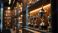 • Trophies, awards displayed on shelves with lighting. Golden cups, metal trophies on showcase. Achievement recognition, success celebration, luxury awards collection. Prestigious prizes on display in
