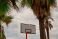 • A basketball hoop and backboard stand firmly installed on an empty autumn beach between palm trees.