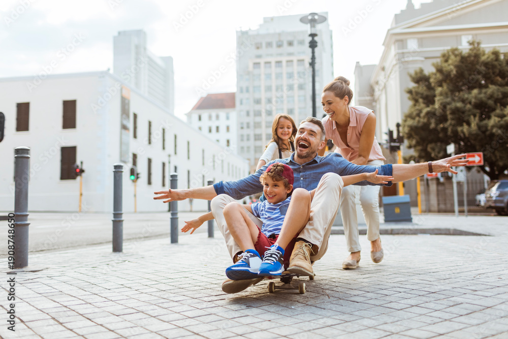 Do Fitness Clubu - Happy family riding a skateboard on a city street #1908748650