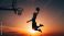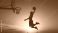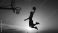 • Silhouette of a basketball player performing a powerful dunk against a beautiful orange and yellow sunset sky, showcasing athletic prowess and dynamic action.