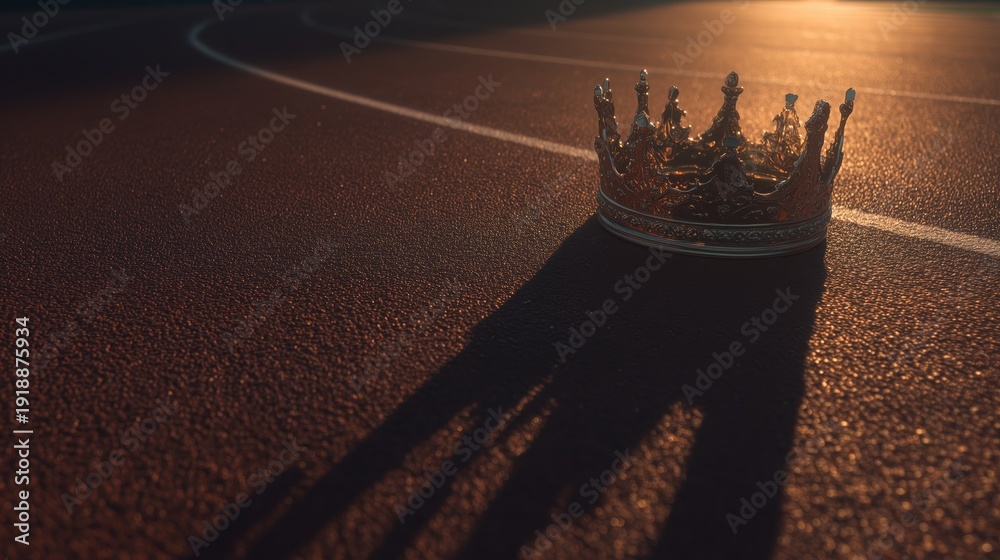 • Golden crown on a running track at sunset symbolizing victory, leadership, and championship success. Inspirational concept for sports achievement, ambition, and elite performance.