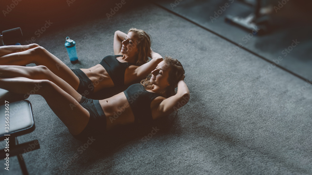 Do Fitness Clubu - sport together - two girls do crunches sit-ups #356633607
