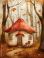 • Urocza, bajkowa ilustracja domu w kształcie muchomora w magicznym, jesiennym lesie. Przytulna chatka ze spadającymi liśćmi, idealna do książki dla dzieci.
