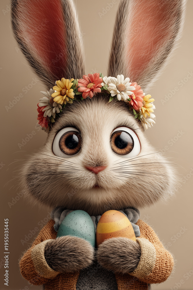 Do Pokoju Dziewczynki - Uroczy, puszysty zając w kwiecistym wianku trzymający dwa wielkanocne jajka. Ciepła i radosna... #1955035445