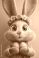 • Uroczy, puszysty zając w kwiecistym wianku trzymający dwa wielkanocne jajka. Ciepła i radosna ilustracja w bajkowym, nastrojowym stylu.