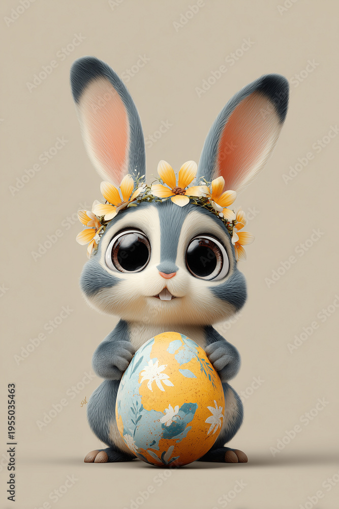 • Uroczy, szary króliczek z wielkimi oczami i wiankiem z kwiatów, trzymający kolorową pisankę. Bajkowa, minimalistyczna grafika wielkanocna.