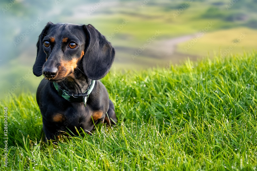 Do Przedszkola - Jamnik siedzący na trawie, odpoczywający na zielonej murawie. Spokojna poza, urokliwy wygląd i... #1286904048