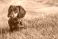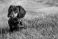 • Jamnik siedzący na trawie, odpoczywający na zielonej murawie. Spokojna poza, urokliwy wygląd i charakterystyczna sylwetka tej rasy.