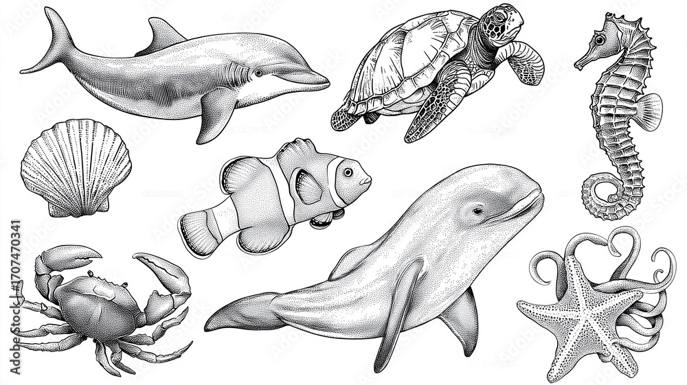 Do Przedszkola - Kolorowanki dla dzieci – Zwierzęta morskie: delfin, żółw, rekin, krab, meduza i inne stworzenia... #1707470341