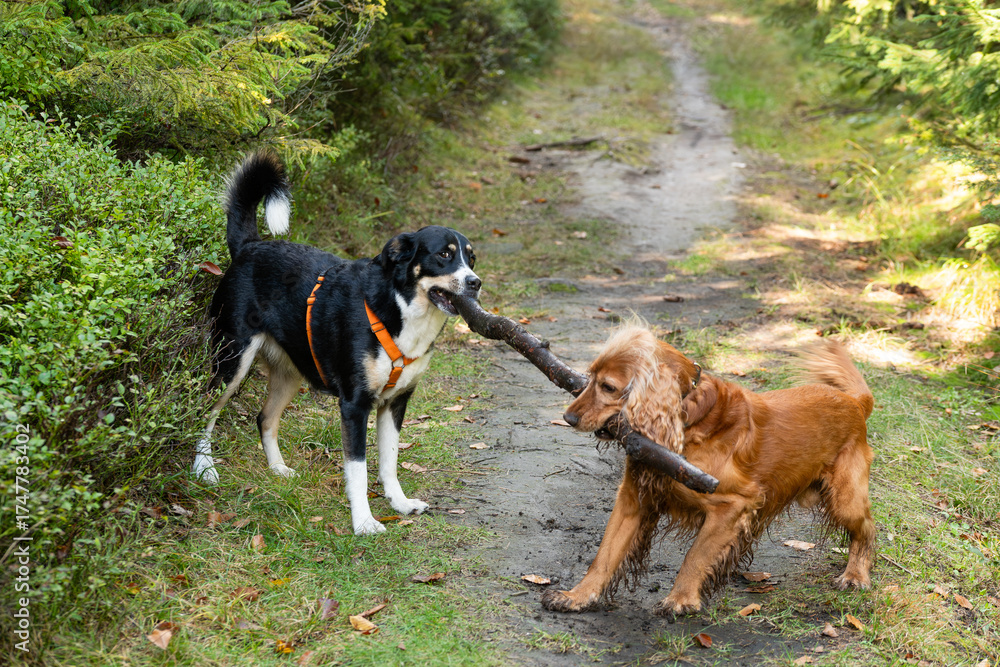 Do Przedszkola - Cocker spaniel i owczarek w typie berneńskiego bawią się kijem w lesie #1747783402