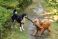 • Cocker spaniel i owczarek w typie berneńskiego bawią się kijem w lesie