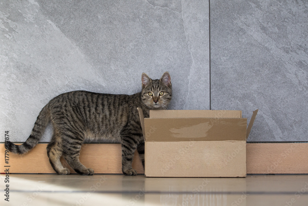 Do Przedszkola - Mały śmieszny szary kot w kartonowym pudełku #1779687874