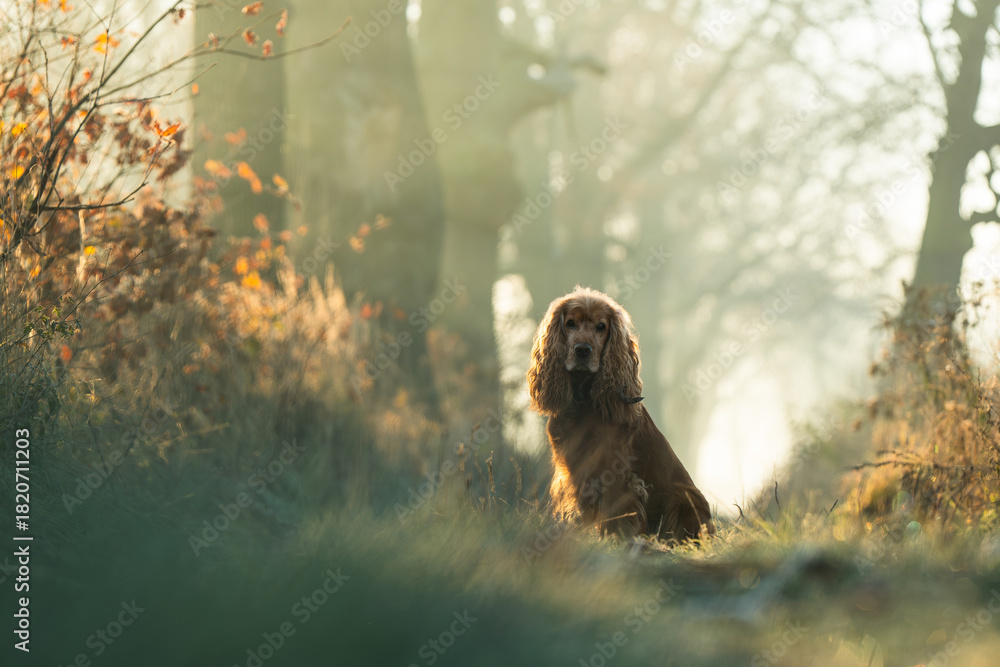 Do Przedszkola - Rudy cocker spaniel angielski na jesiennej leśnej drodze. Ciepłe kolory liści i miękkie światło... #1820711203
