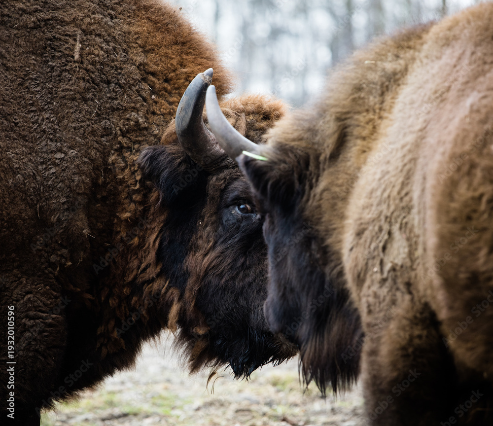 • Stado Polskich żubrów na wiosennej polanie starego lasu
