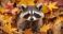 Bliskie ujęcie szopa praczka wśród jesiennych liści, które podkreślają jego unikalną, maskującą twarz i wyraziste, pełne ekspresji oczy.