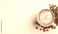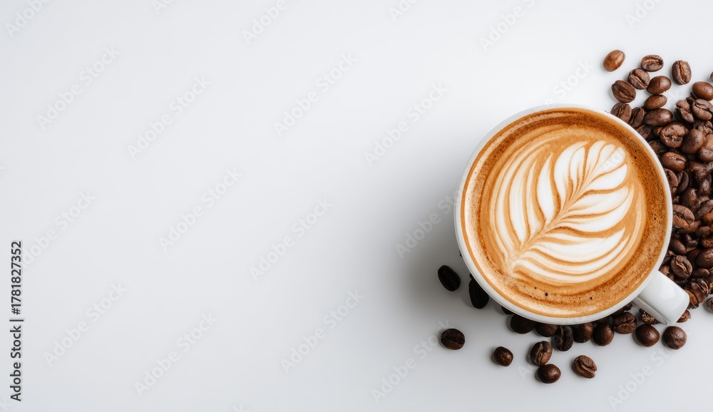 • A latte art design, a leaf pattern, adorns a white mug filled with a rich, light brown liquid, surrounded by scattered coffee beans, against a clean, plain white backdrop.