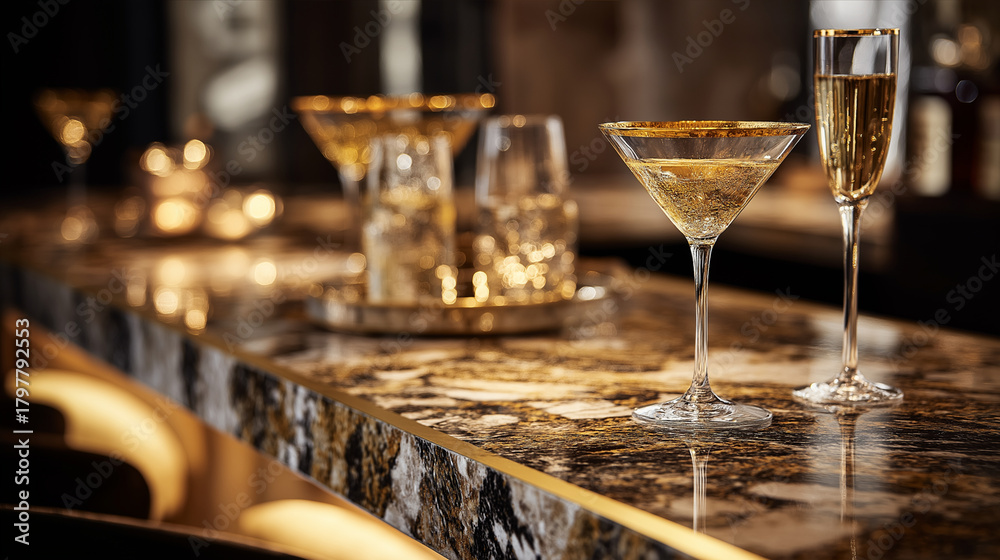 • Luxury Cocktail Glasses on Marble Bar in Upscale Lounge