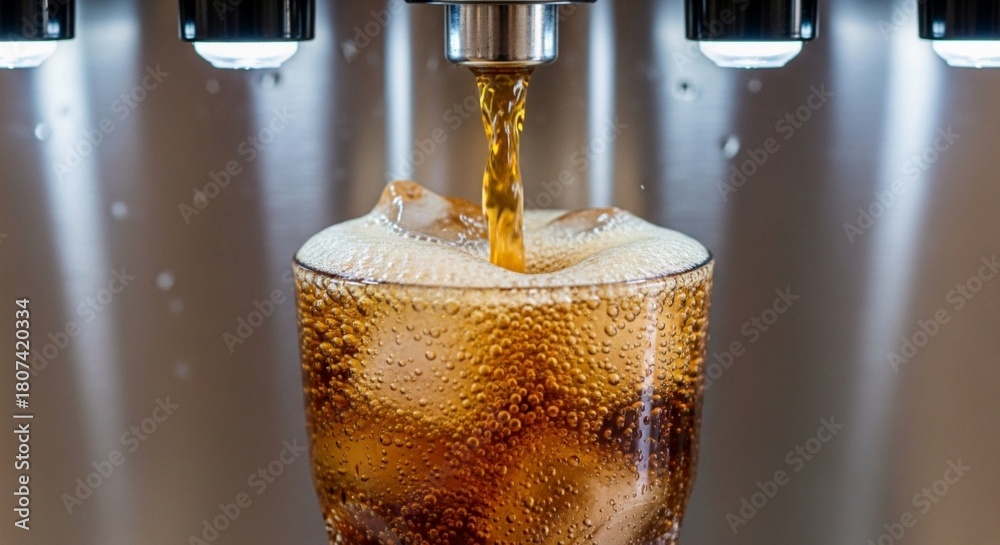• Soda fountain pouring cola into a glass with ice cubes.