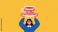• Cheerful woman with a bright smile wearing a blue sweater holds a large red patterned teacup and saucer above her head.